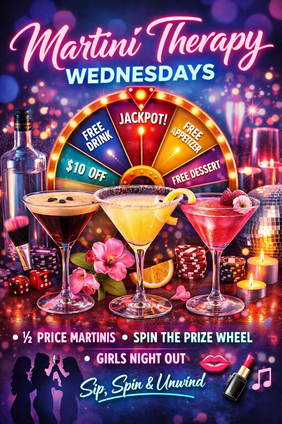 🕕 6 PM – 10 PM Every martini gets you a spin on the prize wheel — free drinks, food, discounts & surprises 👀